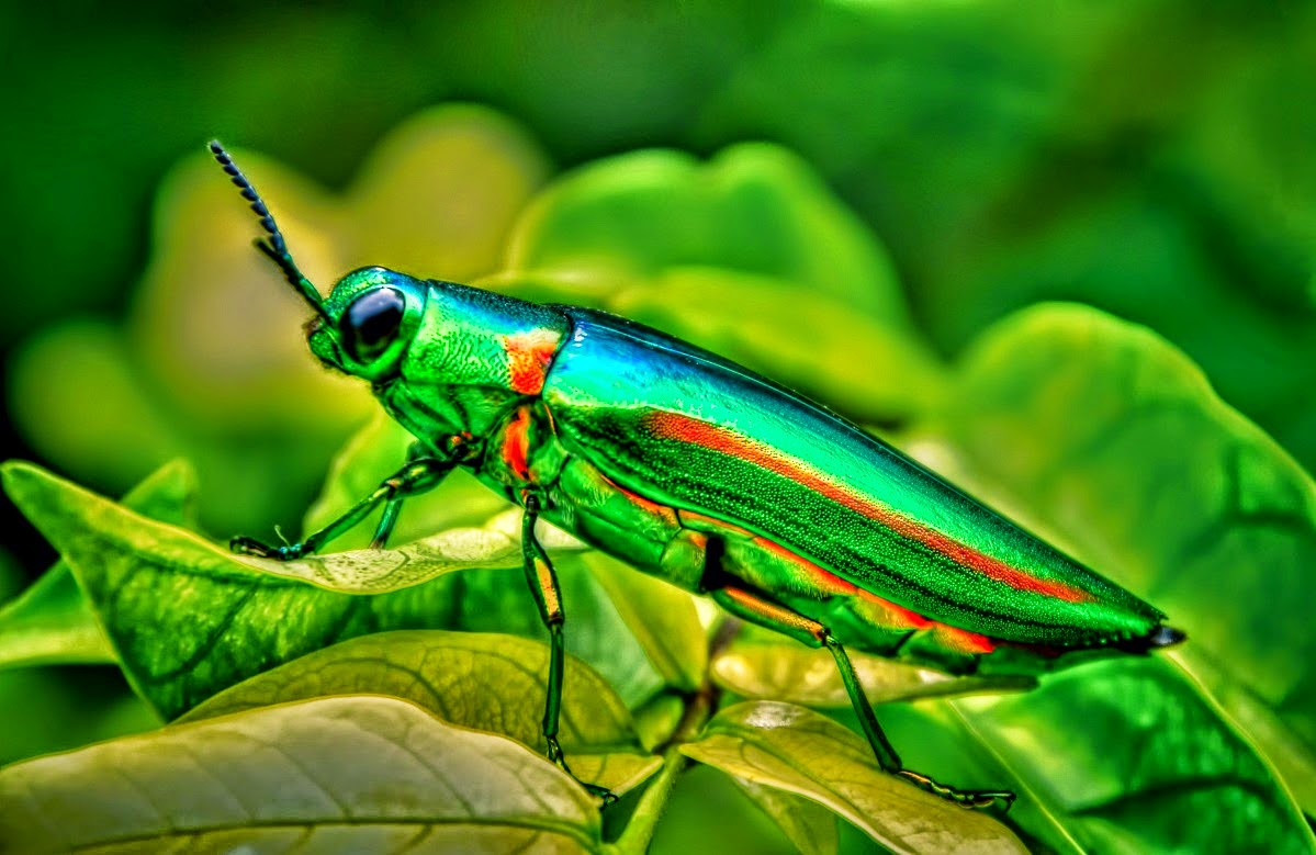 El escarabajo joya puede ser atraído por incendios a 50 kilómetros de distancia. La mayoría de los animales huyen de los incendios, pero el escarabajo joya acude a ellos para poner sus huevos en la madera recién quemada y comen, se aparean y desovan con tranquilidad, porque los depredadores se han marchado de la zona.