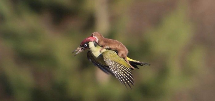La imagen del pájaro carpintero llevando a una pequeña comadreja en su espalda se convirtió en una sensación en Internet y se difundió por todo el mundo. La increíble imagen instantánea fue tomada por el fotógrafo Martin Le-May en el parqueHornchurch de Londres.